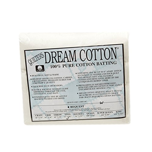- Quilters Dream Cotton starts with the finest USA cotton and is carded crosslapped and specially needlepunched. 100% natural and environmentally friendly our batting proudly bears Cotton Incorporateds seal. Our special process prevents shifting and lumping. It has a very high thermal value (R=3.8) warm in the winter yet wicks moisture away from the body to keep you cool in the summer. This package contains one 93'' x 72'' twin size batting.