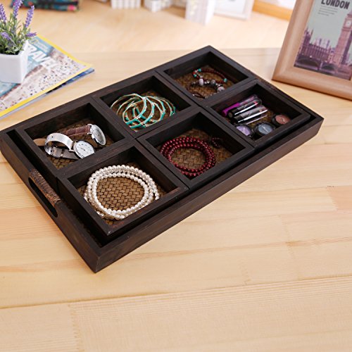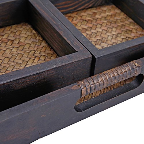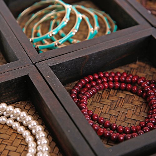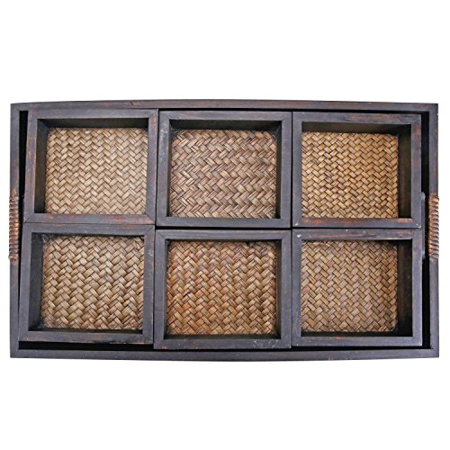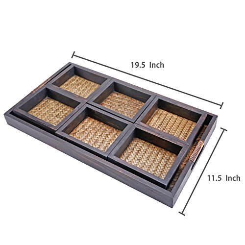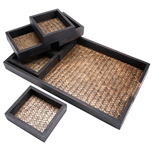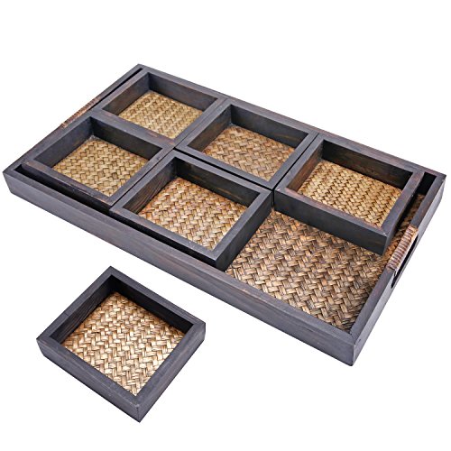 7 Piece Flocked Nesting Mango Wood and Woven Rattan Jewelry Organizer Display Trays