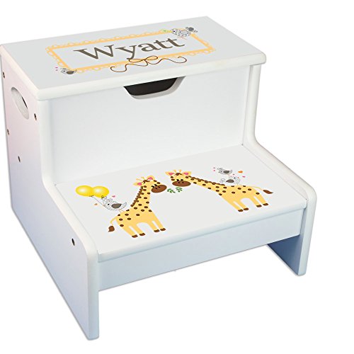 Studio : MyBambino Publisher : MyBambino Binding : Baby Product Product Description Our MyBambino personalized giraffe white childrens step stool with storage is a fantastic stool for the kitchen, bath, or bedroom. Sturdily contructed this stool is designed to last. Comes with handy storage compartment to boot. 0