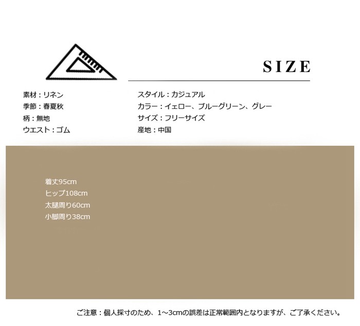 テーパードパンツ レディース スウェット ロングパンツ 無地 リネン パンツ ボトムス 大きいサイズ サルエル ロング丈 チノパン 2018新作パンツ テーパードパンツ スウェット レディース ロングパンツ 無地商品詳細素材:リネン季節:春夏秋柄:無地ウエスト:ゴムスタイル:カジュアルカラー:イェロー、ブルーグリーン、グレーサイズ:フリーサイズ産地:中国サイズ参照表着丈95cmヒップ108cm太腿周り60cm小脚周り38cmご注意:個人採寸のため、1~3cmの誤差は正常範囲内となりますが、ご了承ください。テーパードパンツ レディース スウェット ロングパンツ 無地 リネン パンツ ボトムス 大きいサイズ サルエル ロング丈 チノパン 2018新作パンツ テーパードパンツ スウェット レディース ロングパンツ 無地