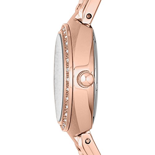 Rose gold-tone stainless steel case and bracelet. Fixed rose gold-tone bezel set with crystals. Rose dial with luminous rose gold-tone hands and alternating Arabic numeral and crystal index. Minute markers around the outer rim hour markers. Minute markers around the outer rim. Dial Type: Analog. Luminescent hands. Date display at the 6 o'clock position. Quartz movement. Scratch resistant mineral crystal. Pull / push crown. Solid case back. Case diameter: 28 mm. Round case shape. Band width: 14 mm. Deployment clasp. Water resistant at 100 meters / 330 feet. Functions: date, hour, minute, second. Casual watch style. Fossil Colleague Rose Dial Rose Gold-tone Ladies Watch AM4508.Feature