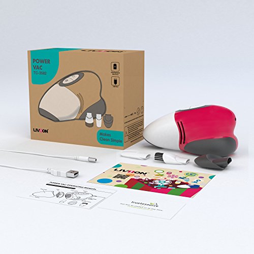 The Mini Desk Vac by Livion Be it spilled coffee grounds or a trail of cookie crumbs, dragging out a full-sized vacuum to clean the kitchen counter or dining table can be a huge hassle. This is when Livion's streamlined and ergonomically designed Mini Desk Vac comes in handy as a cordless mini vacuum. More than Meets the Eye A well designed vacuum cleaner may not seem like much, but with its fun and colorful design, the Mini Desk Vac can even be a decorative piece that doesn't have to be kept out of sight. This means no more rummaging for your vacuum cleaner or leaving things uncleaned. Even the lazy person in us can still keep the inner neat freak happy! Despite being powered by batteries/USB, the Mini Desk Vac still has sufficient suction power, and can easily pick up dirt, crumbs and other small objects (*Small dust particles are harder to pick up, but you can use the brush to sweep into a pile first). To be more eco-friendly, the Mini Desk Vac requires no dust bag and has a removable and washable filter with a built-in dust case. Make Cleaning Fun Not only for adults, but also easy, fun and safe for kids to learn and build up good cleaning habits. SPECIFICATIONS Attachments: 3 sweeper tools for better access to nooks and crannies. (Keep out of reach of children) Power Source: • USB cable: power with devices with USB ports such as computers, power banks, USB wall adapters (Not Included), USB car charger (Not Included) • Battery powered: 4 x AA batteries (Not Included), lasts about 2~2.5 hrs PACKAGE CONTENTS Mini Desk Vac, extension tube, attachment for crevices, brush attachment, USB cable (4 feet) * To ensure your needs are met, LIVION offers a 1-year warranty for defective products. This warranty does not cover incorrect usage such as disassembling, burning, soaking, or dropping it. **Please search for "LIVION Power Vac" on YouTube to see how it works!Feature