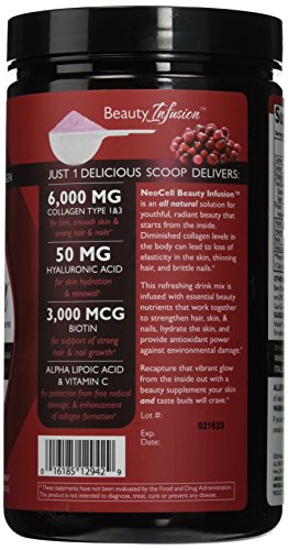 NeoCell Beauty Infusion is an all natural solution for youthful, radiant beauty that starts from the inside. Diminished collagen levels in the body can lead to loss of elasticity in the skin, thinning hair, and brittle nails. This refreshing drink mix is infused with essential beauty nutrients that work together to strengthen hair, skin, & nails, hydrate the skin and provide antioxidant power against environmental damage. Recapture that vibrant glow from the inside out with a beauty supplement your skin and taste buds will crave. Just 1 DELICIOUS SCOOP DELIVERS:5,000 MG Collagen Type 1&3 - For firm, smooth skin & strong hair & nails50 MG Hyaluronic Acid - for skin hydration & renewal3,000 MCG Biotin - for support of strong hair & nail growthAlpha Lipoic Acid & Vitamin C - for protection from free radical damage, & enhancement of collagen formation.Feature