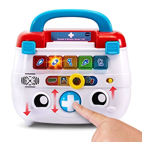Play is the best medicine with the Pretend and Discover Doctor's Kit by VTech. Use the five included medical tools to perform checkups, diagnose patients and make them feel better. Press the stethoscope button to see the face change from sick to healthy, sleepy to happy and more for a range of emotions! Explore three fun activities and press the light-up buttons on the doctor's kit to learn about medical tools, colors and objects. For more role-play fun, the kit includes two patient cards so your little doctor can pretend to treat boo-boos and more. All of the accessories store neatly inside for on-the-go play, because you never know when you'll need to make a house call! Requires 2 AA batteries (batteries included for demo purposes only; new batteries recommended for regular use). Intended for ages 18 months to 4 years.Feature