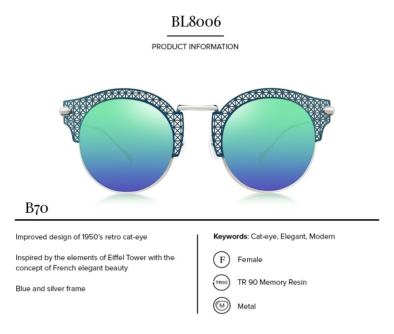 These BOLON sunglasses feature a very chic and elegant CAT EYE shape. This unique design is made of superior SILVER color metal frame with BLUE color UV 400 protection lenses offering exceptional protection from the sun all day long offer and a unique finishing touch, matching to all your outfit styles. Comes with a free premium black leather protective case & a branded cleaning cloth.