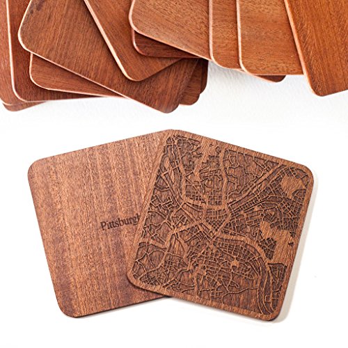 Pittsburgh Map Coaster by O3 Design Studio, Set Of 4, Sapele Wooden Coaster With City Map, Handmade