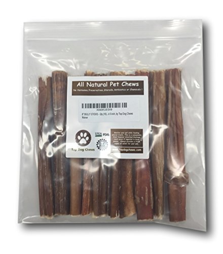 -. Binding : Misc. -. Brand : Top Dog Chews -. EAN : 0854671004610 -. Feature : Top Dog Chews 6 inch bully sticks (10 Pack) / 6" Bully Stick / Standard select bully sticks, thickness will vary since it's a natural product / All Natural Free Ranging Beef / USDA & FDA Approved -. Label : Top Dog Chews -. LegalDisclaimer : Qty 10 in a package -. Manufacturer : Top Dog Chews -. MPN : 8132 -. PackageQuantity : 10 -. PartNumber : 8132 -. ProductGroup : Pet Products -. ProductTypeName : PET_SUPPLIES -. Publisher : Top Dog Chews -. Studio : Top Dog Chews -. Title : 6" BULLY STICKS - Qty (10) USDA & FDA Approved Free Range Regular Thick 6 inch, by Top Dog Chews -. UPC : 854671004610
