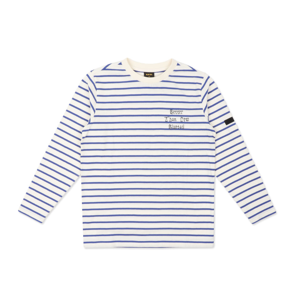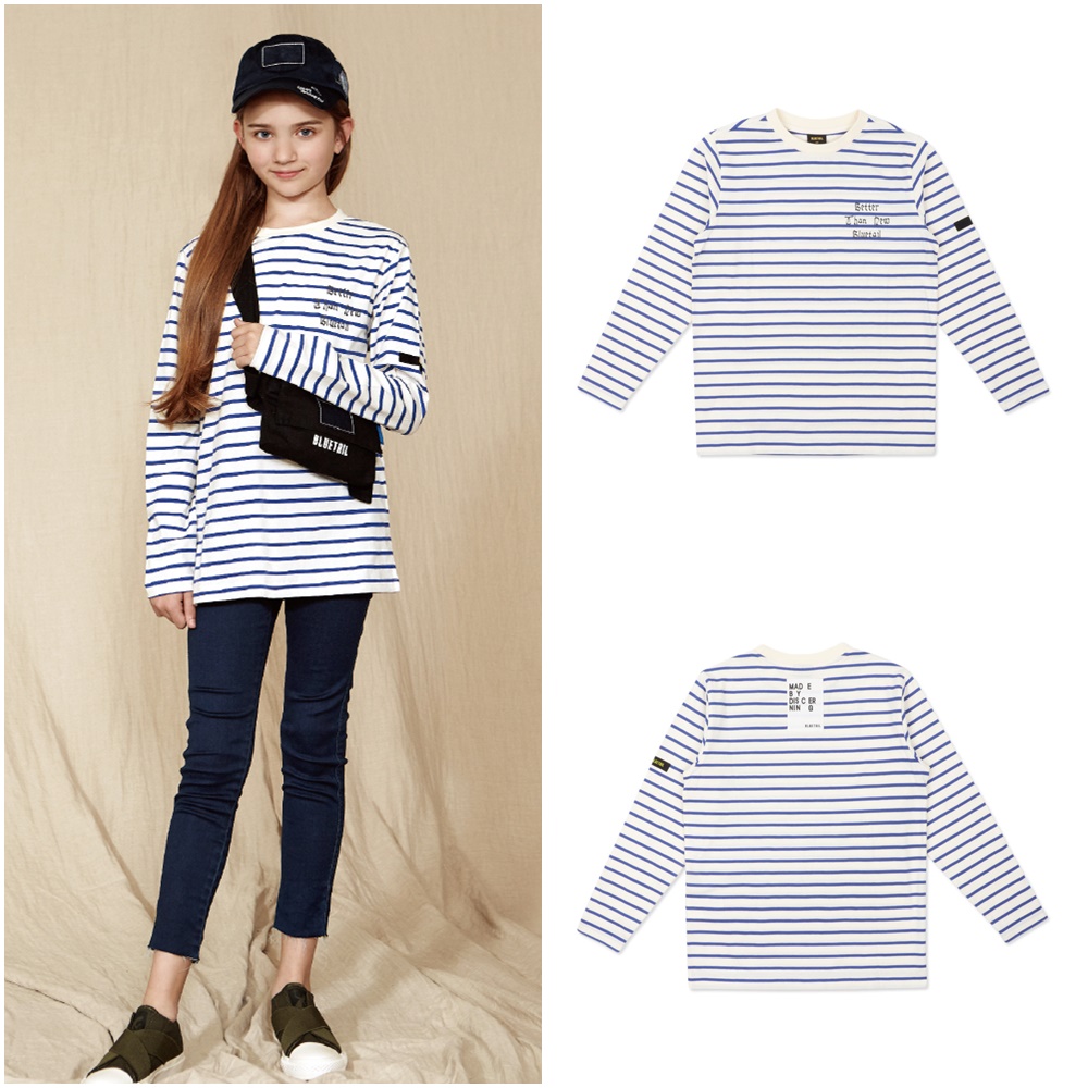 기본 긴팔 기장으로 제안한 클린한 블루 컬러 스트라이프 티셔츠입니다.
