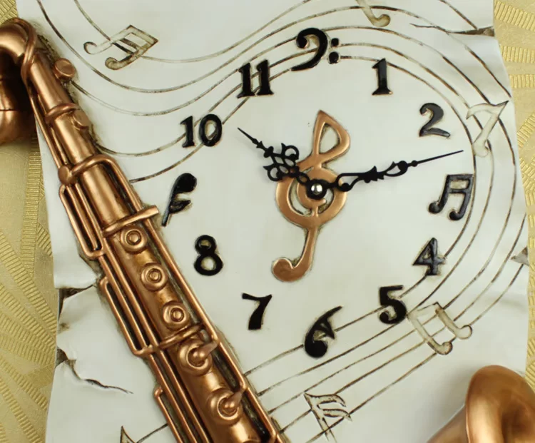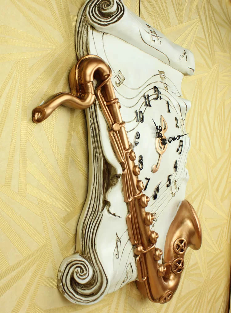 【品名】:*岁月如歌*欧式复古萨克斯挂钟 【产品尺寸】:高49 宽41 厚8CM (中间长方部分高44宽31cm) 【材质】:进口环保树脂 【机芯】:天王星超静音处理 台湾名品 CE认证 国际品质保证 【适合场所】:私家卧室 客厅 餐厅 书房 酒店 商务会所 办公室 【营造氛围】:格调高雅 浪漫主义 艺术氛围