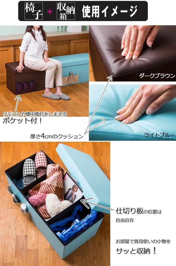 小物を収納できるイスです。リビングやオットマン、ドレッサーチェアや子供部屋など、あらゆる場面で活躍!!リモコンや懐中電灯などをしまえるポケットもついています。好きな位置に装着できる仕切り板付なので、箱の中もきちんと整頓できます。ワイドタイプです。 |