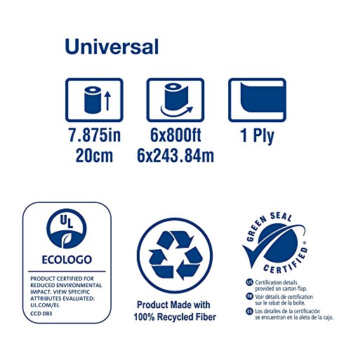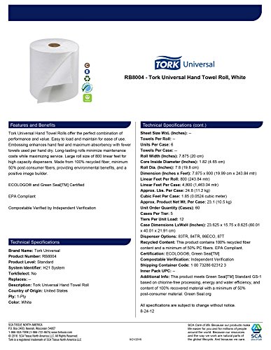 -. Feature : Tork Universal Hand Towel Rolls are soft, strong and highly absorbent - offering the perfect combination of quality, performance and value / Includes paper towel embossing to enhance hand feel and provide maximum absorbency with fewer towels used per hand dry / Long-lasting rolls of 800 linear feet minimize maintenance costs while maximizing service / Green Seal Certified, EcoLogo Certified, EPA Compliant, Compostable and made from 100 percent recycled material, with a minimum of 50 percent post-consumer fibers, providing environmental benefits and a positive image builder / For use with the Tork 84TR, 83TR, 86ECO, and 87T roll towel dispensers