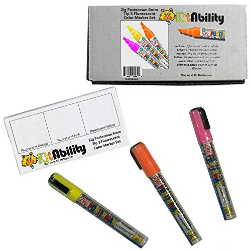 Feature : Ziggy's Choice Zig Posterman Waterproof 6mm Tip Fluorescent set includes three colors. / Zig Posterman Waterproof 6mm Tip Markers feature a chisel tip that creates both thin and thick lines on signs, glass, paper, and more. / Colors include fluorescent yellow, fluorescent orange, and fluorescent pink. / Markers are waterproof but wash off easily with Windex, xylene free, non-toxic, odorless, and highly opaque. / Ships in a sturdy, reusable storage box and includes instructions on priming and storing your Zig Posterman Waterproof markers.