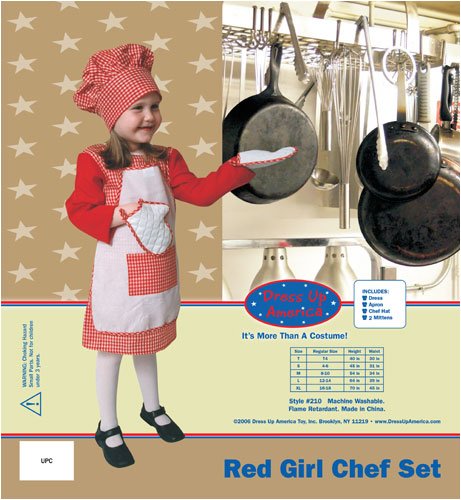 -. Brand : Dress Up America -. Color : Red -. Department : girls -. Feature : ► Product comes complete with: Dress, Apron, Chef Hat and Mitten / ► Dress features modest long sleeves / ► Made with 100% Polyester Featuring: resistant to most chemicals, stretching and shrinking, wrinkle resistant, mildew and abrasion resistant / ► Apron includes a pocket for oven mitt / ► This costume is adorable and your daughter will love it -. Label : Dressup America -. Manufacturer : Dressup America -. Model : 210 -. PackageQuantity : 1 -. ProductGroup : Baby Product -. ProductTypeName : BABY_COSTUME -. Publisher : Dressup America -. Studio : Dressup America -. Title : Red Gingham Girl Chef Costume Set By Dress Up America