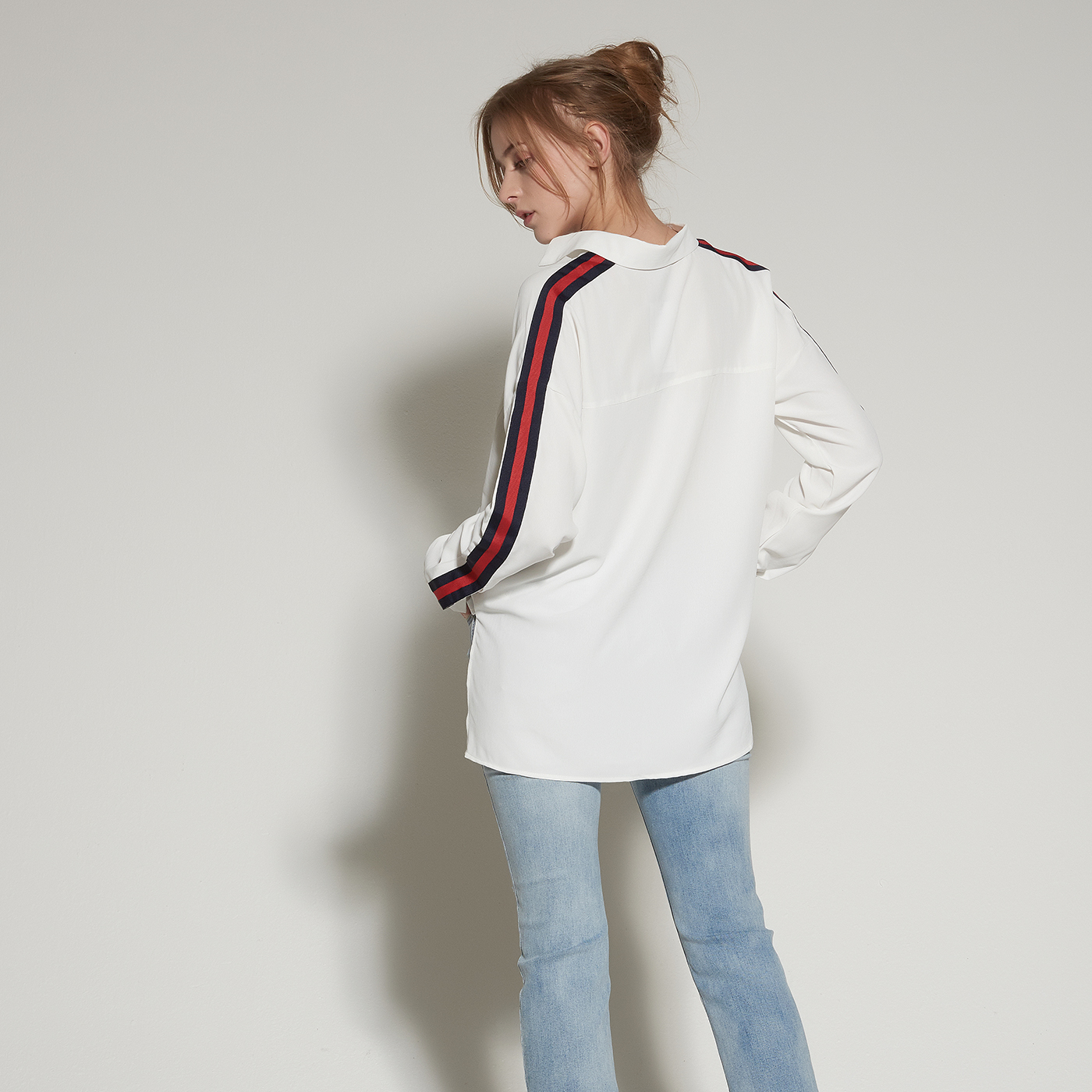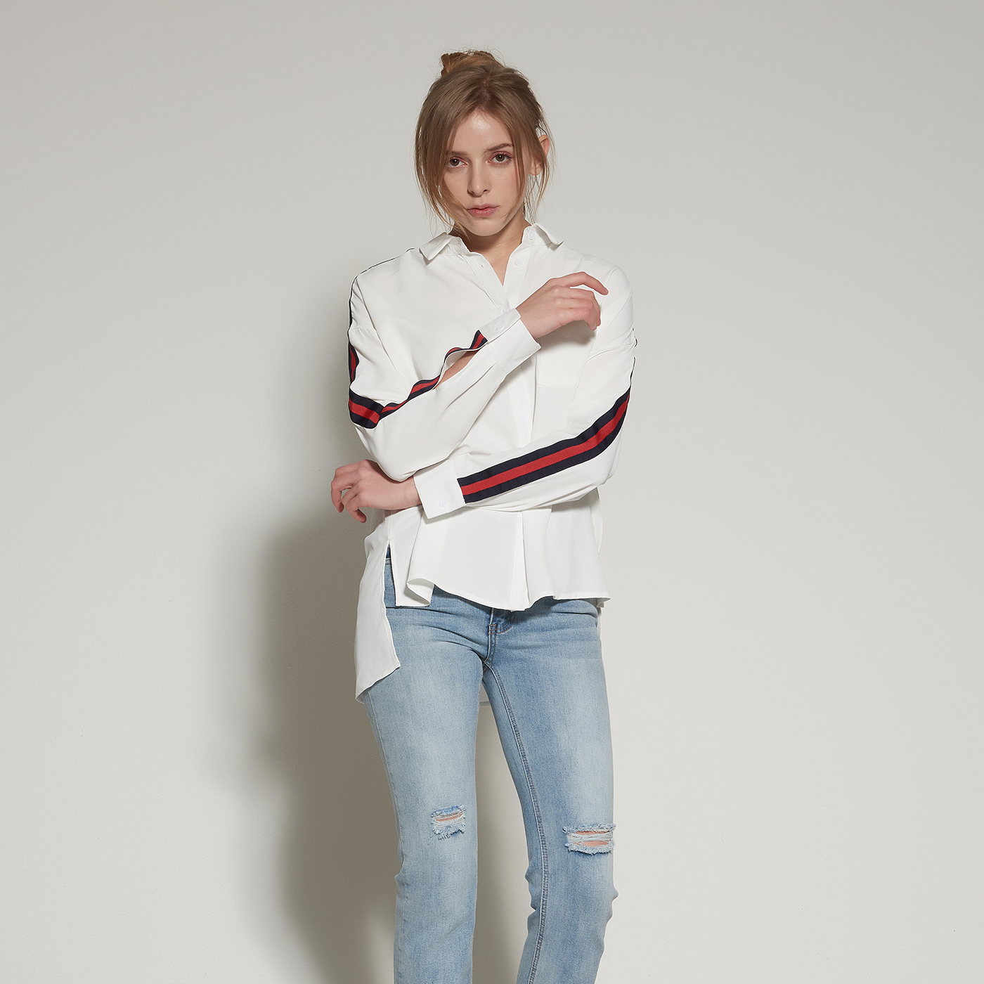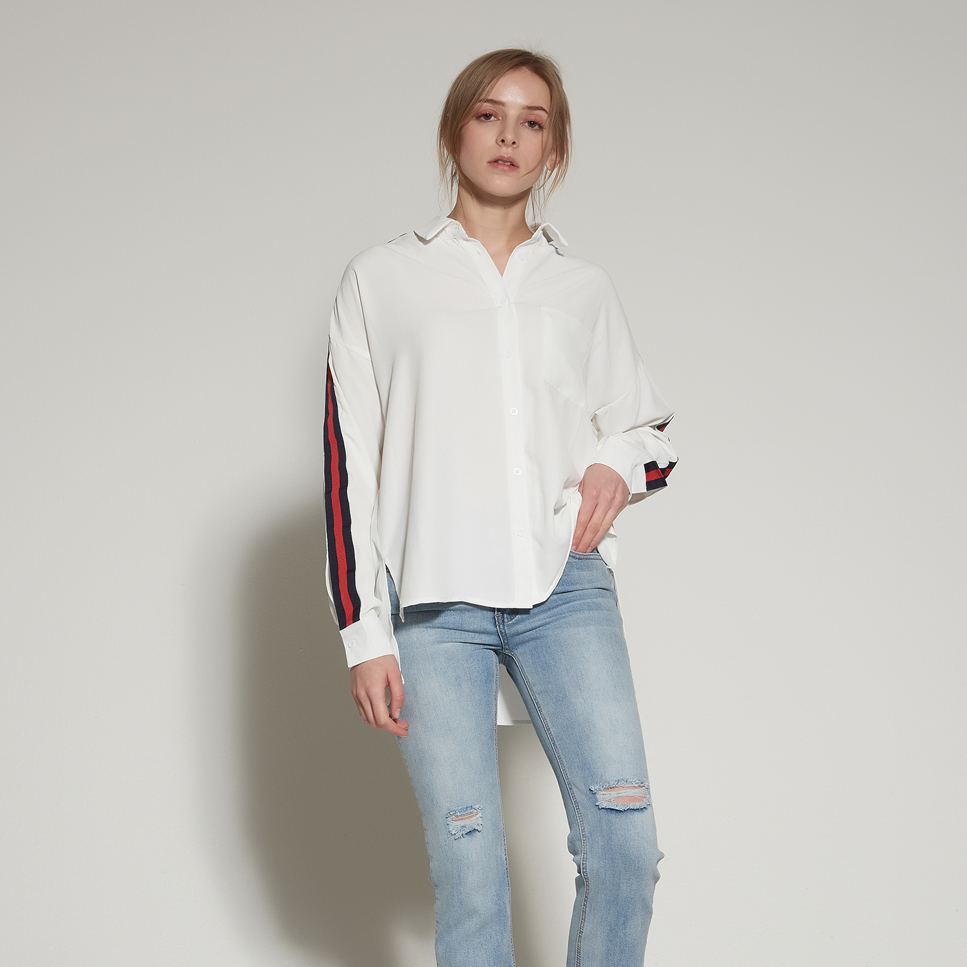 소매라인의 스트라이프 디자인 디테일이 멋진 시크하고 박시한 셔츠입니다.