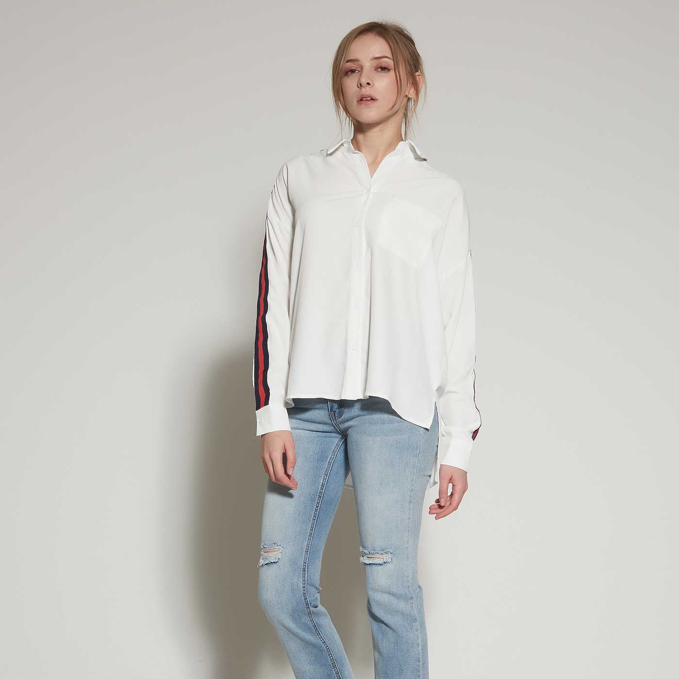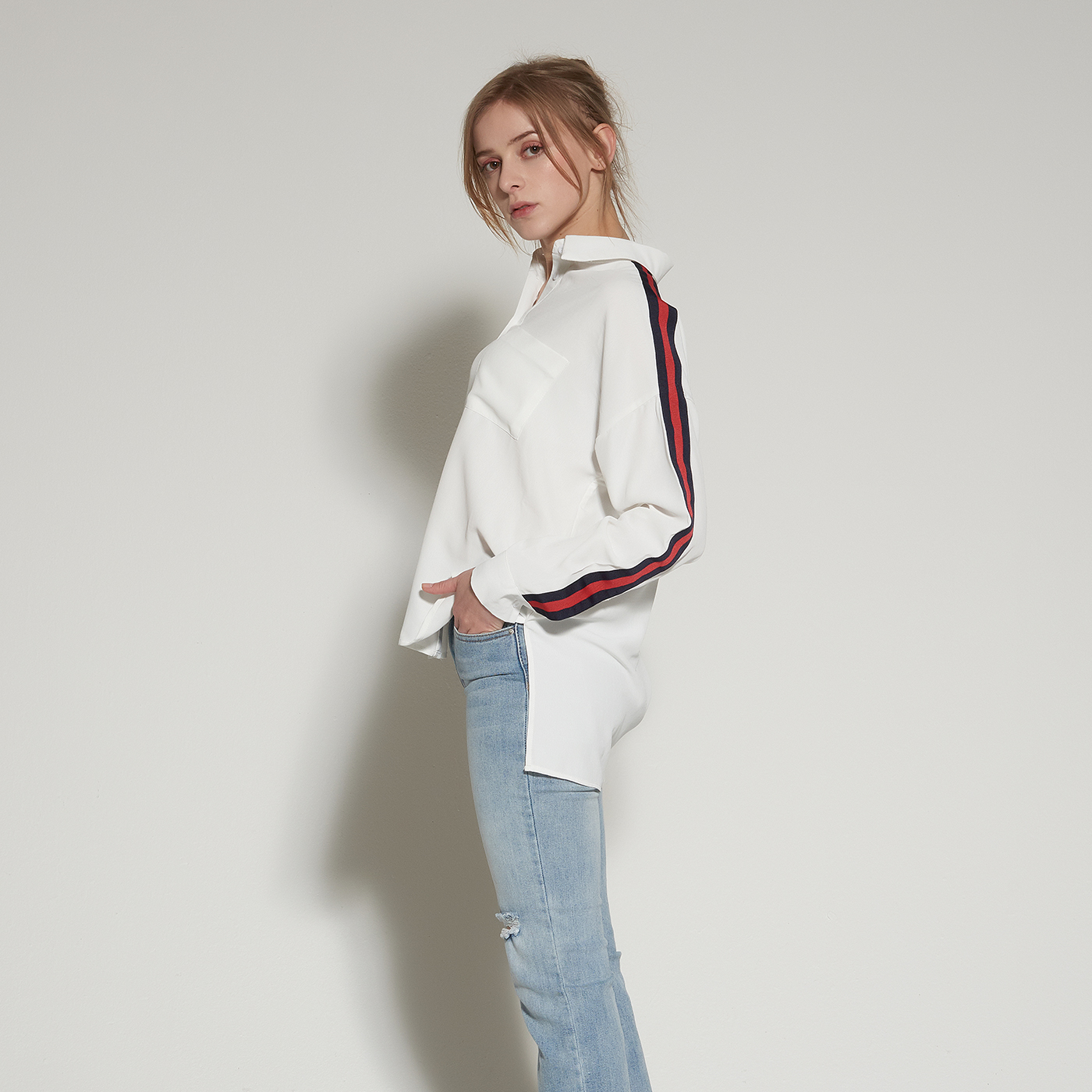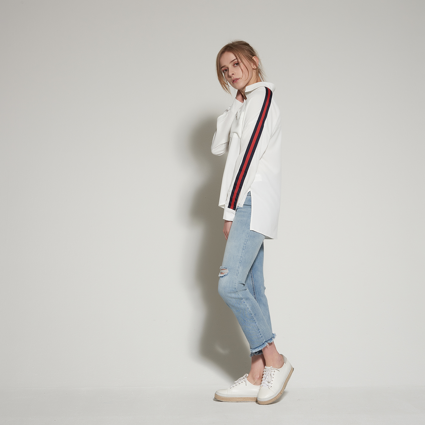 소매라인의 스트라이프 디자인 디테일이 멋진 시크하고 박시한 셔츠입니다.