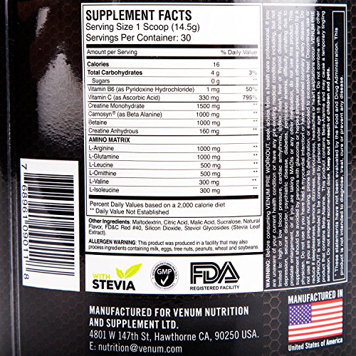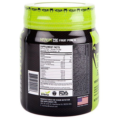 ReleaseDate : 2015-11-16 Studio : Venum Publisher : Venum Binding : Health and Beauty Product Description Our pre-workout is designed to pack a knockout punch and keep you pushing your limits with one of the most powerful formulas on the market. Every 2 scoop serving delivers a massive 320mg of caffeine, 2000mg of Carnosyn beta alanine, 2000mg L-Arginine, 1000mg L-Ornithine, 2000mg of betaine, 3000, mg of creatine, in addition to vitamin C, B6 l-glutamine and BCAAs. The result is a product tat will exceed your preconceptions of what a pre-workout supplement should be, and keep you amped and focused through the toughest of workouts. 0