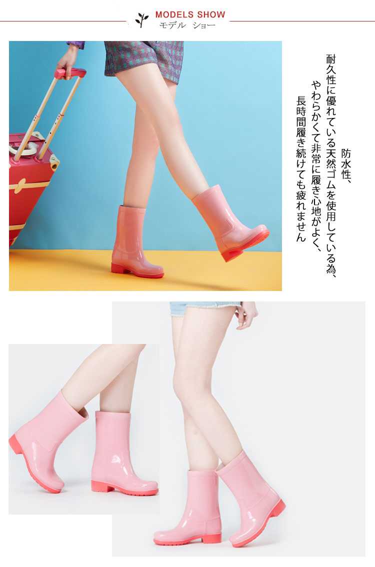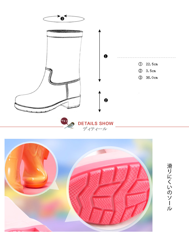 | 防水性、耐久性に優れている天然ゴムを使用している為、やわらかくて非常に履き心地がよく、長時間履き続けても疲れませんアウトドアなどにも汚れを気にせずガシガシ使用して頂けます雨の日でもキュートなレインブーツでお出掛けも楽しくなっちゃいます程よい高さのヒールで歩きやすさと美脚効果を両立 | |
