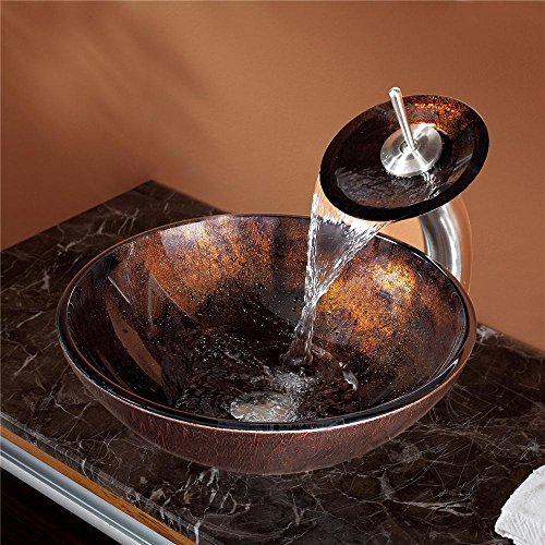 Kraus C-GV-684-12mm-10SN Pluto Glass Vessel Sink and Waterfall Faucet Satin Nickel
