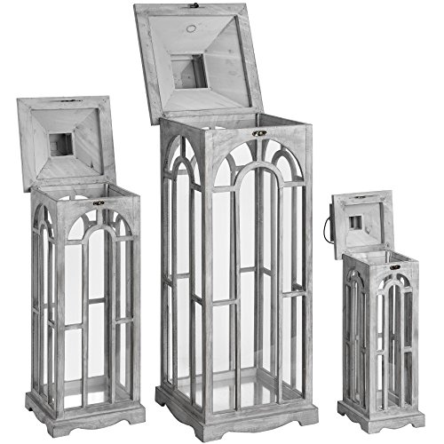 -. Feature : Set of 3 wooden candle lanterns with archway design and top handles for easy carrying. / Features glass panels and a metal clasp for securing each door. / Top handles for easy hanging or holding. / Size (Largest): 40.9in x 12.4in x 12.4in.