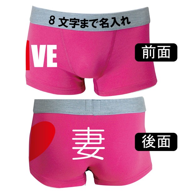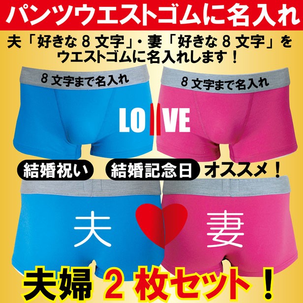 結婚記念日のプレゼントにオススメ!名入れのできるボクサーパンツ2枚セットです。青パンツには夫の文字、ピンクパンツには妻の文字がヒップに入っています。サイドにはハートマーク半分がプリントされており、夫婦二人でに並んだ時、ひとつのハートマークになります。前面は、夫用にLOの文字、妻用にVEの文字が入っており、こちらも並んだ時にLOVEという文字が完成するようになっております。さらに、ボクサーパンツのウエストゴム部分にお好きな文字を8文字まで名入れ(オリジナルプリント)致します。夫婦別々でお好きな文字を入れることが可能です。文字は黒色(書体:ゴシック体)になります。※特殊文字は避けてください。ご希望の文字をご購入画面の備考欄に、夫「○○○○○○○○」・妻「○○○○○○○○」と記入してご注文ください。