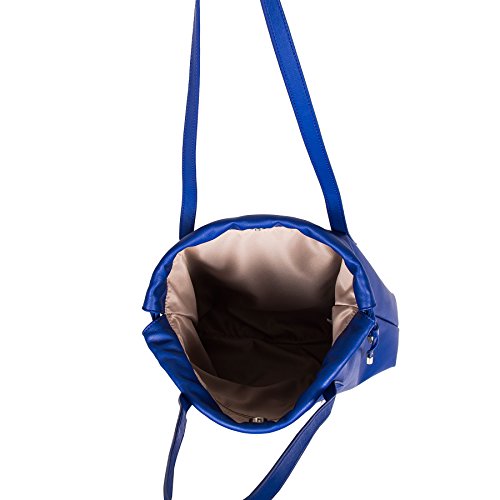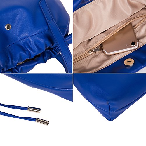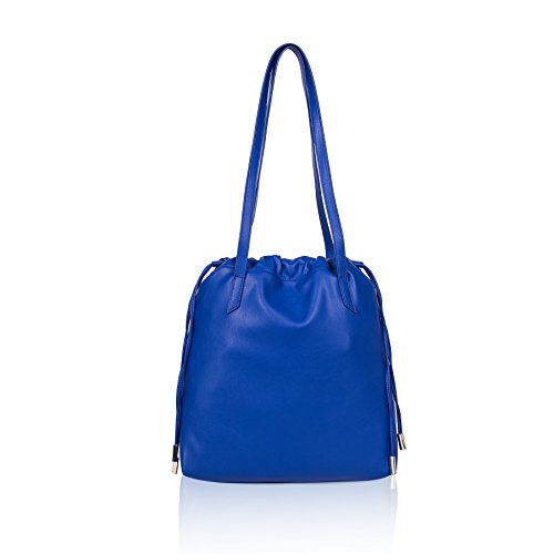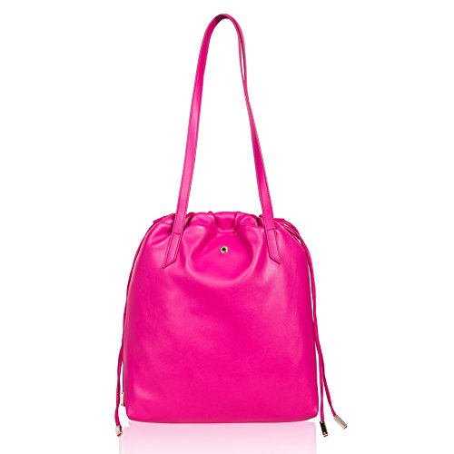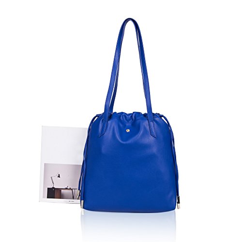 Doudble over shoulder handle straps. Magnetic snap centred closure. Drawstring in function and decoration purpose, end with metal keepers. Inside zipped pocket