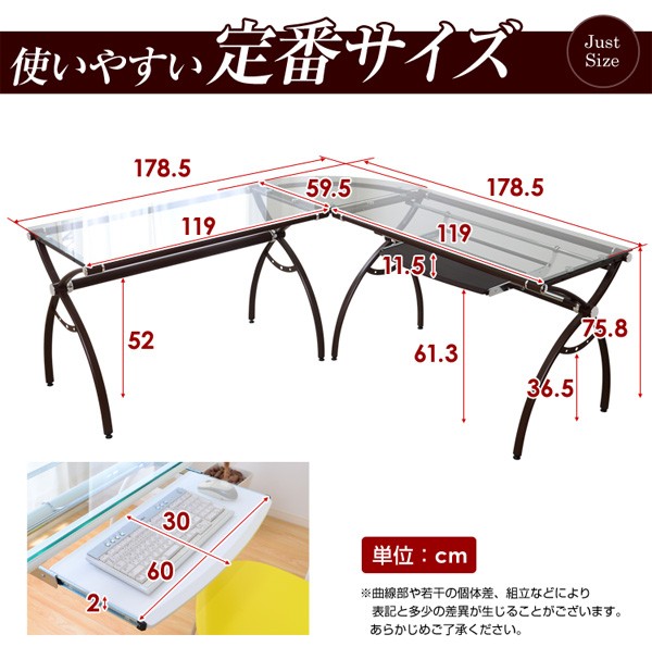 【商品について】※こちらのページは【ラバイン(L字型タイプ)】のページです※■サイズ:外寸:(約)幅178.5×奥行き178.5×高さ75.8cm■カラー:ホワイト ダークブラウン■素材:天板:強化ガラスフレーム:スチールキーボード:プリント紙化粧繊維板■その他:・お客様組み立て商品です。・2梱包でのお届けとなります。・商品重量:(約)57kg   ※メーカー直送品、商品代引き不可