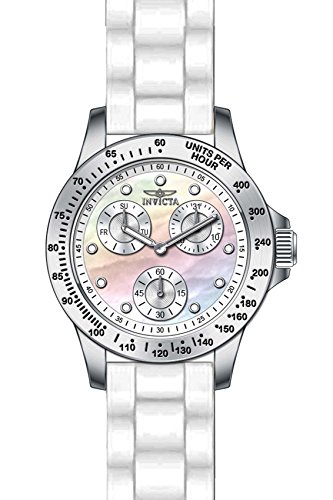 With elegance and style, the Speedway collection carries with it the quality that Invicta's known for while creatively moving forward in assembling the perfect look. The warm design complements the gorgeous white mother of pearl dial and accentuates the comfortable white silicone strap while propping up the strength of its spectacular 100 meter water resistance capability. Complete your collection with one today. This website is an authorized reseller of Invicta and each piece comes with the manufacturer warranty.Feature