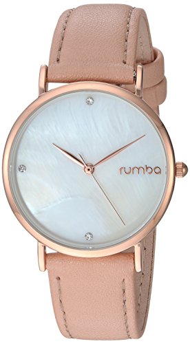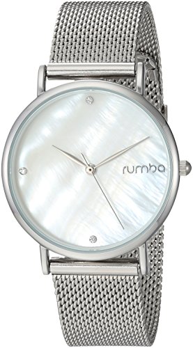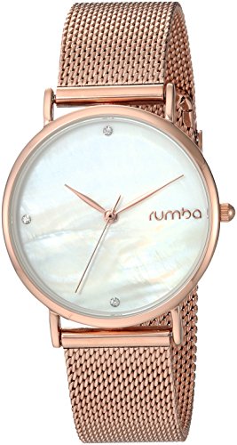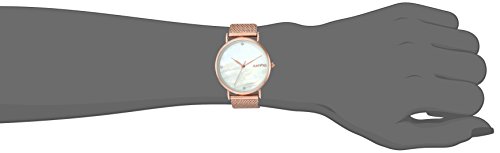 The Lafayette collection features an interchangeable quick release strap, mother-of-pearl dial with crystals at the 12, 6, and 9 o'clock positions, and a rose gold-plated stainless steel mesh bracelet.