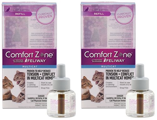 -. Binding : Misc. -. Brand : Comfort Zone -. EAN : 0039079001632 -. Feature : Helps Reduce the Frequency and Intensity of Tension & Conflict Between Cats in Homes with Multiple Cats. Helps to create a calming environment / Start to See Results in a Week / Veterinarian Recommended & Clinically Proven / Package Contains: 2 - 48 ml Refill Vials. Refill lasts 30 days / Diffusers not included / Use Comfort Zone Multicat together with Comfort Zone Feliway if the cats urinate, mark, and scratch as well as have tension and conflict -. Label : Farnam Home & Garden -. Manufacturer : Farnam Home & Garden -. MPN : 100523762 -. PackageQuantity : 2 -. PartNumber : 100523762 -. ProductGroup : Pet Products -. ProductTypeName : PET_SUPPLIES -. Publisher : Farnam Home & Garden -. Studio : Farnam Home & Garden -. Title : (2 Pack) Comfort Zone Feliway Multicat Diffuser Refill for Cat Calming -. UPC : 039079001632