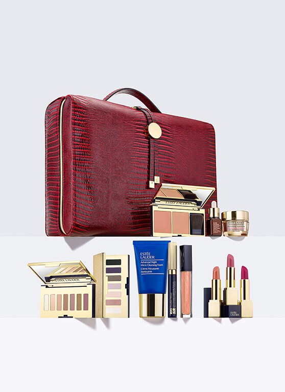 ホリデーを象徴する赤いコスメティック バッグの中に、エスティ ローダーを代表するスキンケアから華やかなメークアップを叶えるアイテムまで多彩に集めた限定セット。