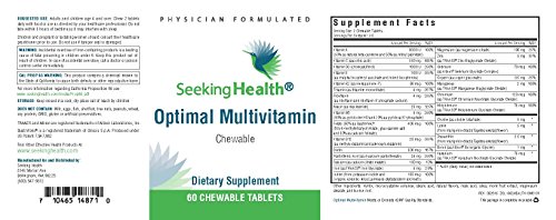 -. Binding : Health and Beauty -. Brand : Seeking Health -. EAN : 0828054148178 -. Feature : Provides a balanced mix of 28 important nutrients in well-tolerated, easy-to-absorb forms* / IMPORTANT: Optimal Multivitamin Chewable is manufactured for and sold exclusively by Seeking Health on Amazon.com. We DO NOT recommend purchasing this product from any supplier other than Seeking Health on Amazon. / Especially well-suited for individuals who have trouble swallowing capsules or tablets. / Suitable for children (consult with a healthcare provider to determine appropriate dosage) or adults. / Free of major allergens. Does not contain: Dairy, Egg, Fish, Shellfish, Tree Nuts, Peanuts, Wheat. Uses only natural flavors and colors. -. Label : Seeking Health -. Manufacturer : Seeking Health -. MPN : OPMULTI-60-TAB -. PackageQuantity : 1 -. PartNumber : OPMULTI-60-TAB -. ProductGroup : Health and Beauty -. ProductTypeName : HEALTH_PERSONAL_CARE -. Publisher : Seeking Health -. Studio : Seeking Health -. Title : Optimal Multivitamin Chewable | 60 Chewable Tablets | Seeking Health -. UPC : 710465148710