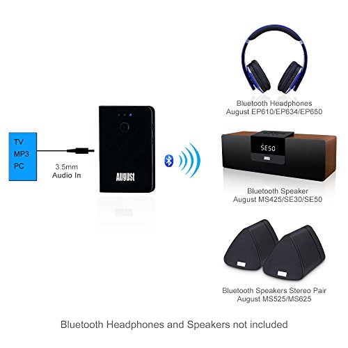 -. Binding : Electronics -. Brand : August -. Color : Bluetooth Transmitter - White -. EAN : 5053047002860 -. Feature : Bluetooth Audio Transmitter - Add Bluetooth to any TV or sound system and wirelessly send music to headphones, speakers, and Bluetooth receivers / Plug & Play System - No Software Needed - Pairs to your Bluetooth device simply and swiftly / TV Adapter for Bluetooth headphones - Enjoy movies through the August EP650 and other Bluetooth Headphones / Standard 3.5mm Audio Out - Connects to all standard 3.5mm headphone sockets to send audio / Built In Rechargeable Battery - Approx. 8 hours of portable playback -. IsAutographed : 0 -. IsMemorabilia : 0 -. Label : August -. Manufacturer : August -. Model : MR250 -. MPN : MR250 -. PackageQuantity : 1 -. PartNumber : MR250 -. ProductGroup : CE -. ProductTypeName : HEADPHONES -. Publisher : August -. Studio : August -. Title : August MR250 Bluetooth Wireless Transmitter for August EP650 / EP640 / EP636 (White)