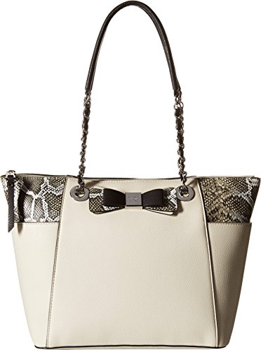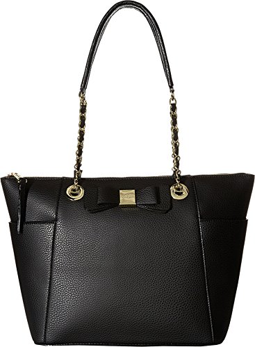Combination rolled and chain shoulder strap. Top zip closure. Exterior zip pocket. Flat bottom base. Interior back wall zip pocket with additional slip pockets. Imported.