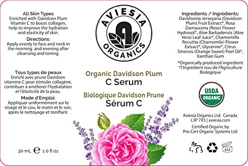 Start using all natural ingredient facial serum today. Aviesia Organics skincare products are USDA Certified for a true pristine organic product. Our Key Ingredient : Davidson Plum, known for it antioxidant qualities, is the key ingredient in this extraordinary serum, this unique blend offers the skin the benefits of super fruit antioxidants while boasting incredible amounts of vitamin C. Vitamin C has the ability to tighten, brighten, firm and return elasticity to the skin. The Davidson Plum Extract is considered the organic fountain of youth. Our Serum in light brown colour.Organic products must be stored within 15°C - 24°C (59°F - 75°F).