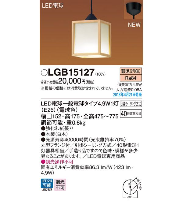 ●光源:LED電球一般電球タイプ4.9W1灯(E26)(電球色)、色温度:2700K、光源寿命40000時間(光束維持率70%)