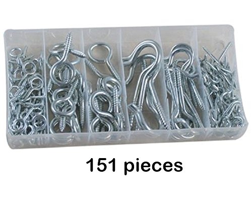 WHAT YOU GET – You get 151 pieces of assorted Eye Bolts and Eye Hooks. There are 6 sizes that come with this assortment. The Six Sizes are: 60 pcs - 1-1/8"" eye screws, 12 pcs - 1-13/16 eye screws 5 pcs 1-15/16 eye screws 50 pc 3-3/8 hook screws 12pc 2-1/2 hook screws.