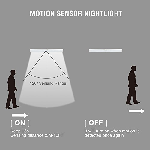 [PIR MONTION SENSING]:Auto-on within 3 meters /10 feet,auto-off 15s after peole leave which can prolong battery life.Pls note that this only work when it is dark enough and when motion is detected.Be used in the dark areas like cupboard,hallway,stairs,wine racks etc.The sensing range is 120 degree.