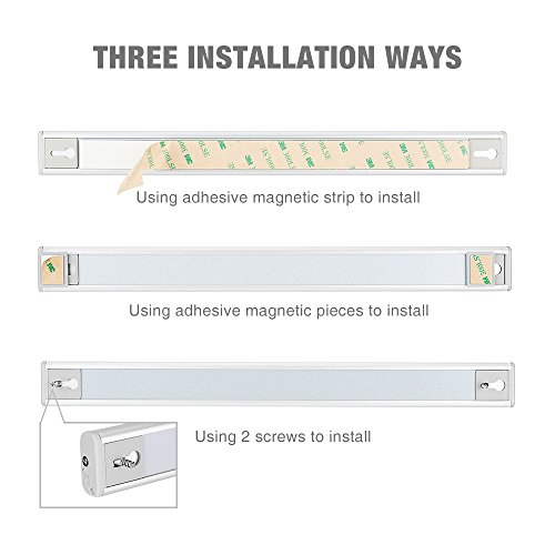 [THREE INSTALLATION WAYS]:This wireless sensing light comes with 2 adhsive magnetic strip,2 adhsive magnetic,2 screws which give you 3 times to install it and when you want to reinstall it on other areas.