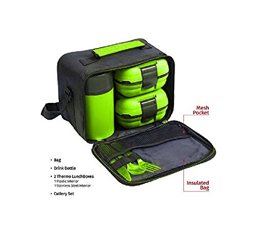 Studio : Pinnacle Publisher : Pinnacle Product Description Fresh 'N' Go Pinnacle lunch kit is so versatile that you will surely find countless uses for it. The lunch kit includes: * 2 -16 oz. insulated leak proof lunch boxes, 1 with a stainless steal interior which is not microwave safe and 1 with a plastic interior which is microwavable. They keep your food warm for up to 4 hrs. and cold for up to 6 hrs. and are great to fill with your favorite salads, oatmeal, pasta...or whatever food you love.The lunch boxes are very convenient as they stay cool to the touch even with hot foods. *A multi-use 0.6 ml. thermo bottle w/cover that can be used either for a cup or bowl for soups, juices or water. The kit also includes very nice matching cutlery for a stylish look. The lunch bag also offers some extra space for taking along some toast, bread or cereals...or even using just 1 lunch box and adding an apple with snacks...It can be used in so many ways just be creative and enjoy a tempting healthy fresh lunch. All you have to do is pack your favorite food into those stylish and modern containers which will keep them fresh and tasty, warm or cold till mealtime rolls around. Its a great healthy choice as it keeps your food warm without having to reheat it which damage your foods essential nutrients and taste. Its hassle free and perfect for anytime as school, office, lunch, sports or travel. With its compact trendy designed lunch bag and Pinnacles leak proof containers transporting your food will be clean, neat, simple and a pleasure! To retain temperature Pre-fill lunchbox with hot water and wait several minutes prior to use. For cold foods fill with cold water several minutes. Lunchbox works best when completely filled. Do not place in dishwasher. 0 |