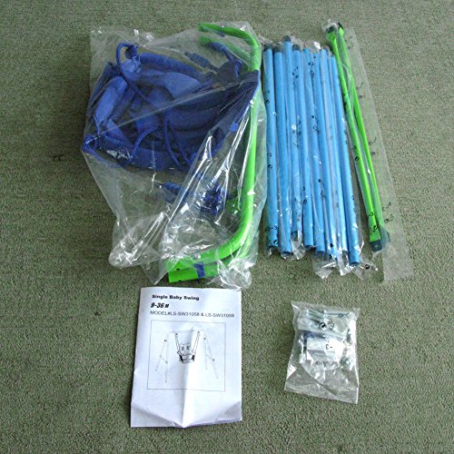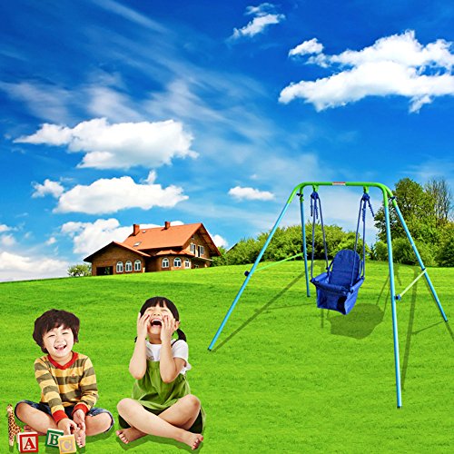 Main material: high qulaity steel pipe frame, plastic base and cloth chair.The chair is equipped with seat belts, safe straps and lock design can effectively protect children from falling from the swing. Package includes: Steel frame pipes, cloth seat and rope The adult supervision is recommended.