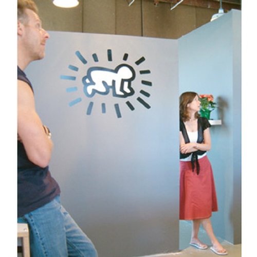 Keith Haring Design.These self-adhesive wall decals allow you to easily transform the look of any nursery in minutes. Affix the stickers to any smooth, flat surface such as a wall, window, mirror, ceiling, tabletop or floor. Choose your space, plan the design you'd like to make, and literally, just peel and stick. And when you're ready for a re-design the decals are removable.Available in black and white or yellow and lime.2 - 10 inch babies with glow lines/pack
