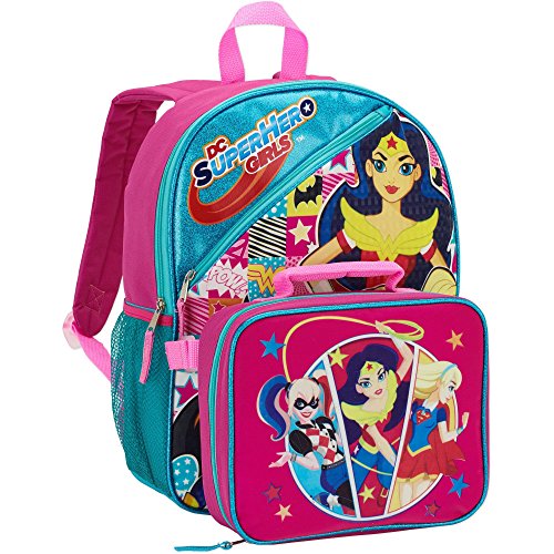 -. Brand : DC Comics -. Color : pink -. Department : girls -. EAN : 0840716156130 -. Feature : DC Super Girls Trio 16" Full Size Backpack w/ Detachable Lunch Bag, made of 100% polyester for durability, this trendy style is great for all-round use and has a zippered main compartment & detachable lunch bag, with adjustable shoulder straps for a comfortable custom fit and a locker loop for stowing -. ProductGroup : Apparel -. ProductTypeName : LAGE -. Size : One Size -. Title : DC Super Hero Girls 16 Full Size Backpack with Detachable Lunch Bag -. UPC : 840716156130