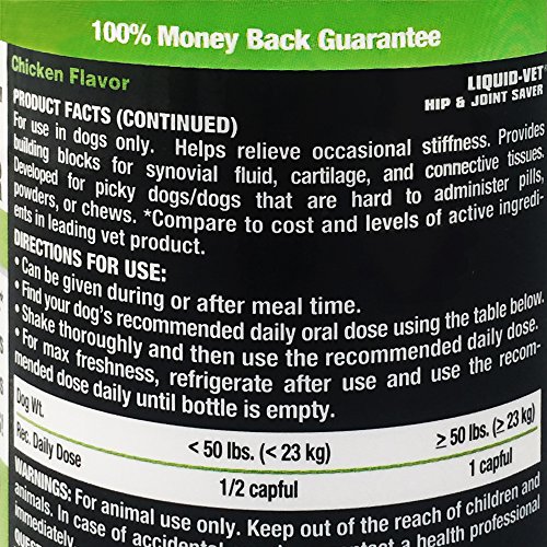 Liquid-Vet K9 Hip & Joint Saver Formulas help relieve occasional stiffness and contain the highest levels of glucosamine, MSM, hyaluronic acid, and chondroitin in a single dose. Liquid-Vet K9 Hip & Joint Saver Formulas are TASTIER, EASIER TO USE, and FASTER than pill, powder, or chewable form supplements and are the only products available in a choice of flavors for picky pets or those pets that may have allergies to specific proteins. Simply dose during mealtime with no mixing required. Guaranteed in 2 weeks or YOUR MONEY BACK.Feature