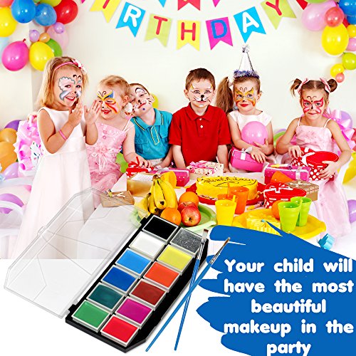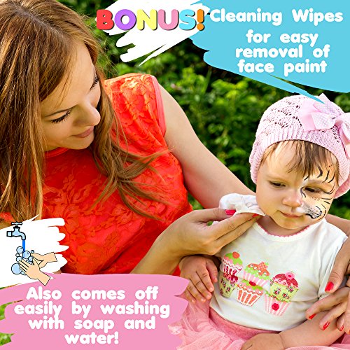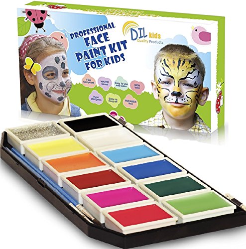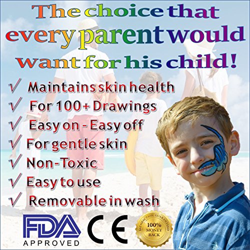 HOURS OF FUN-FILLED ACTIVITY FOR KIDS Both budding artists and confirmed doodlers will love this first rate face painting set for kids! It is perfect for birthday parties, celebrations or casual rainy day and summer play, as well as for costume masquerades, dress up, skits, school plays and play-acting. Makes a wonderful gift for children everywhere! SUPERIOR QUALITY PAINT SET Packaged in a sturdy plastic case, the generous set includes 11 vibrant rainbow colors and silver glitter in ample quantity. They lift out of the palette and close individually to maintain freshness. Use the thick brush to cover larger areas, and the thin brush for outlines, fine lines and detail. reusable stencils will delight girls and boys alike. Colors last up to 12 months once opened. SAFE, SKIN-FRIENDLY MATERIALS Even kids with sensitive skin will delight in these hypoallergenic paints for kids! Safe, nontoxic, lead-free, paraben-free and FDA-approved. For kids age 3 Avoid use on cracked or infected skin. Keep away from mouth and eyes. Apply initially on small area to test. Adult supervision recommended. EASY TO PUT ON TAKE OFF Paints are easily applied and dry within a minute or two for optimal fun. Lasts up to 12 hours! No need to scrub or use abrasive materials; simply use soap and water to remove from skin or clothing FREE DOUBLE BONUS Select design ideas for your child's next disguise or mask with our numerous BONUS online instructional videos, and help them become the animal, superhero or cartoon character of their dreams! Who said you have to be a professional artist to enjoy painting? When finished playing, our BONUS pack of convenient cleaning wipes will help you do the job! LIFETIME GUARANTEE Hurry up and make your RISK-FREE purchase now! Backed by a Lifetime Guarantee, it's your complete satisfaction - or your money back! 0 |