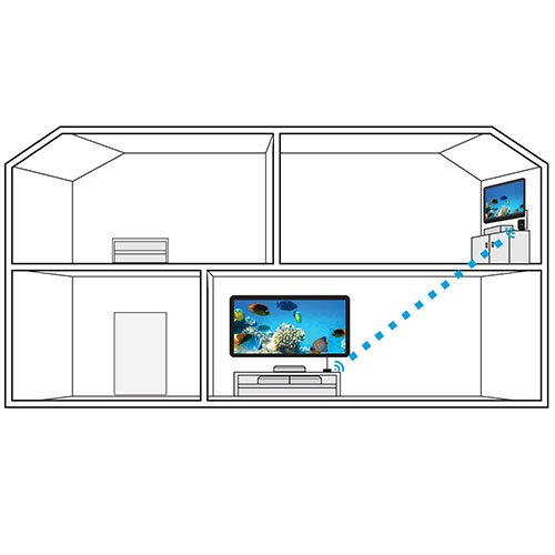 - Feature : Wirelessly stream true 1080p high definition 3D video and audio to your HDTV or projector up to 100ft. Broadcast movies, TV shows, games, and music from your cable box, Bluray player, gaming console, satellite, PC, Mac, laptop, and more / Powerful long range signal transmits uncompressed HD video and audio through walls, ceilings, and floors with zero latency (streaming line of sight results in maximum range); control your devices from any room in your house with the IR remote extender / Transmit up to two media devices with 2x HDMI inputs. Easily switch between sources without unplugging / Use the loop-through wired HDMI output feature to set up two separate HDTV environments - one wired and one wireless allowing for one source to be viewed on two displays at the same time / Simple plug 'n play setup gets you watching quickly; no software or WiFi connection required; eliminates the inconvenience of installing messy cables