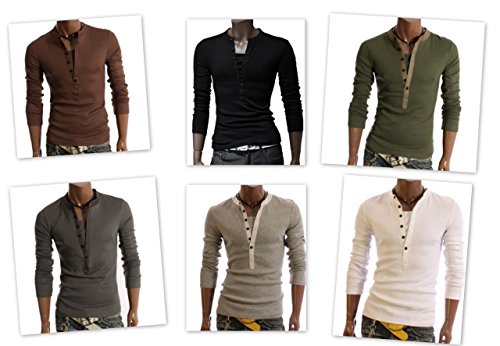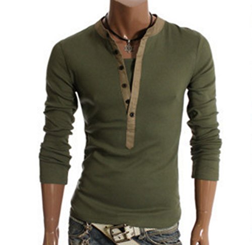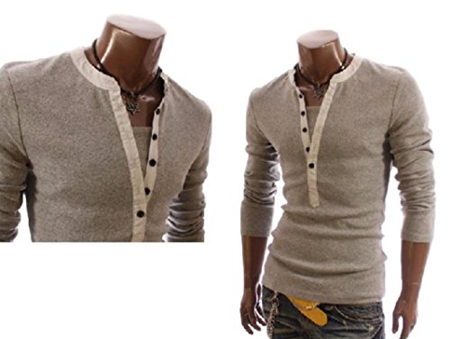 -. Feature : Mサイズ ・・・・・ 着丈 63cm 胸囲 90cm 肩幅 40cm 袖丈 58cm / Lサイズ ・・・・・ 着丈 65cm 胸囲 92cm 肩幅 41cm 袖丈 59cm / XLサイズ ・・・・・ 着丈 68cm 胸囲 94cm 肩幅 42cm 袖丈 60cm / 1枚で重ね着 風のおしゃれ な 長そで Tシャツ。 / 襟元の切り替えアクセントと ボタン が かっこいい お洒落 ポイント。男らしい着こなしを楽しめます。