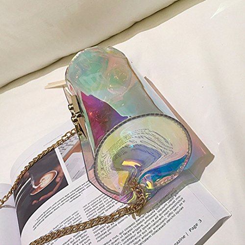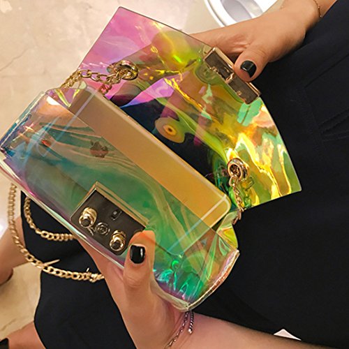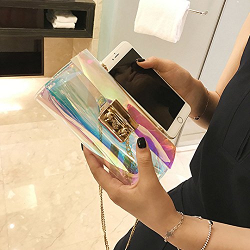 Made of high quality PU leather; soft, comfortable and durable. Holographic deign decorates the shoulder bag so fashionable, stylish and full of personality. Multi-functional, you can use it as clutch, handbag, shoulder bag or cross-body bag. Long chain shoulder strap makes it so practical and convenient to carry. Magnetic snap closure combined convenience to take in or out your stuffs and the security of the stuffs inside. Can hold your phone, wallet, sunglasses, cosmetics and so on. Perfect for casual, shopping, summer beach, party, wedding dating and travel.