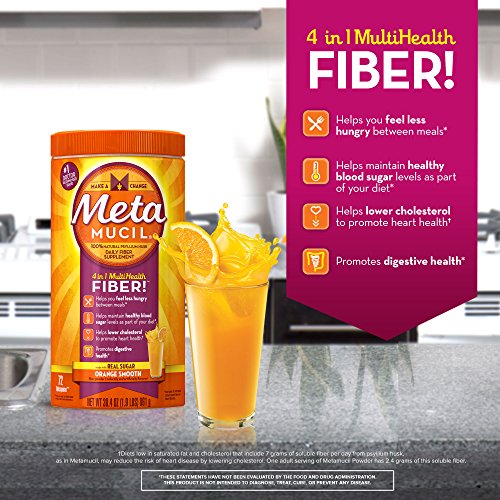 4 in 1 MultiHealth Fiber! Helps you feel less hungry between meals, helps maintain healthy blood sugar levels as part of your diet, helps lower cholesterol to promote heart health and promotes digestive health. Diets low in saturated fat and cholesterol that include 7 grams of soluble fiber per day from psyllium husk, as in Meta, may reduce the risk of heart disease by lowering cholesterol. One serving of Metamucil has 2.4 grams of this soluble fiber. Consult a doctor if you are considering use of this product as part of a cholesterol-lowering program or if you are currently using medication to control your blood sugar levels. These statements have not been evaluated by the Food and Drug Administration. This product is not intended to diagnose, treat, cure, or prevent any disease.Feature