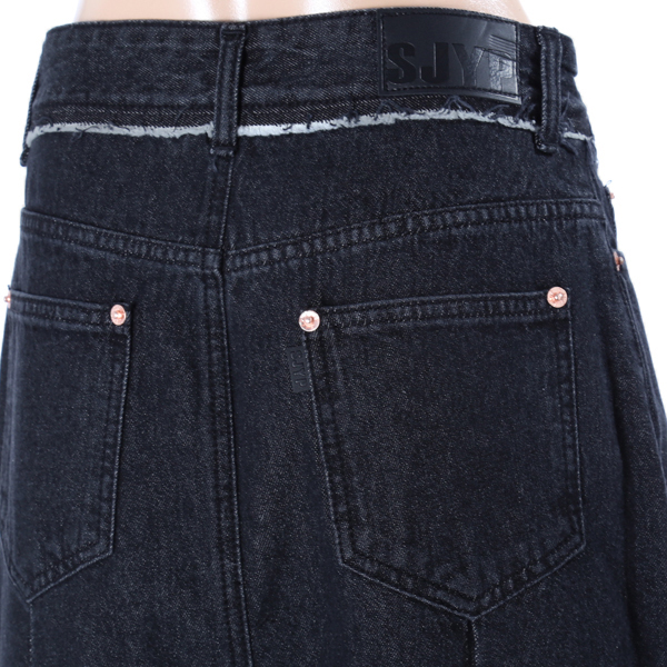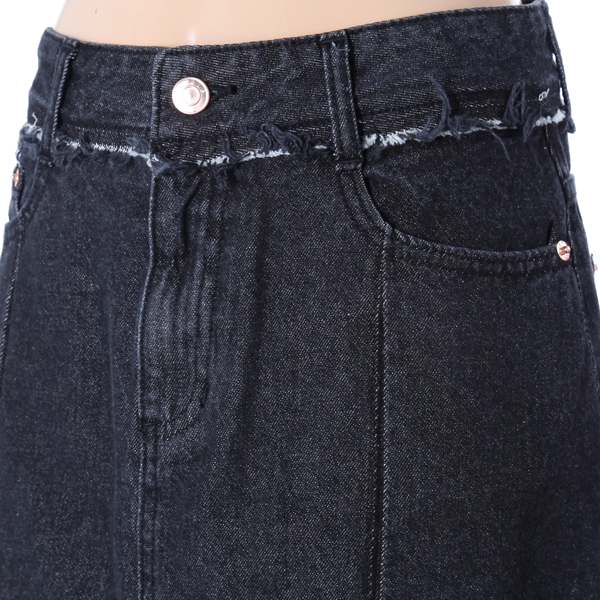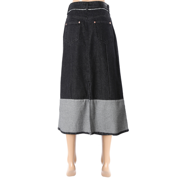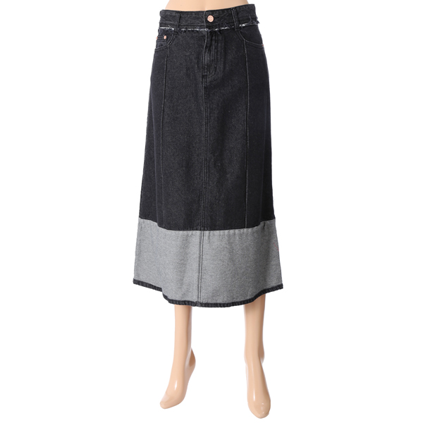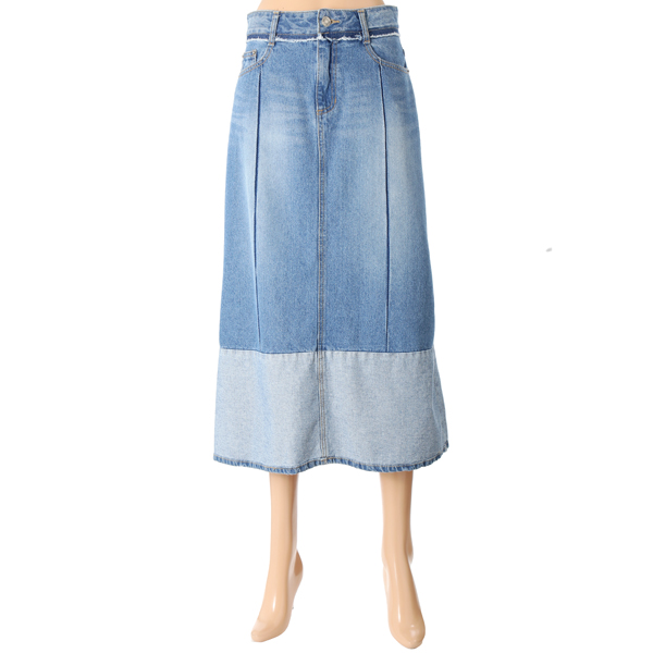 하단의 배색과 전면의 턱 디테일이 돋보이는 데님 스커트입니다.