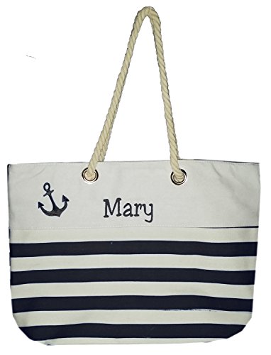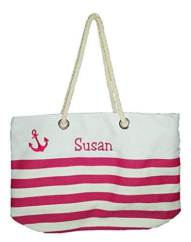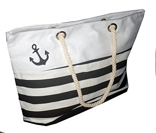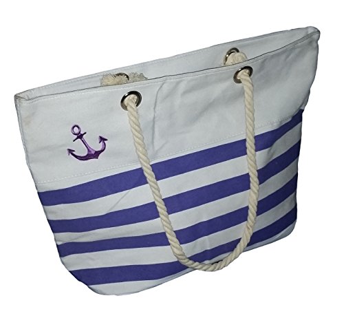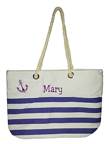 -. Title : Custom Nautical Stripe Anchor Accent Zipper Beach Bag Tote with Rope Handles